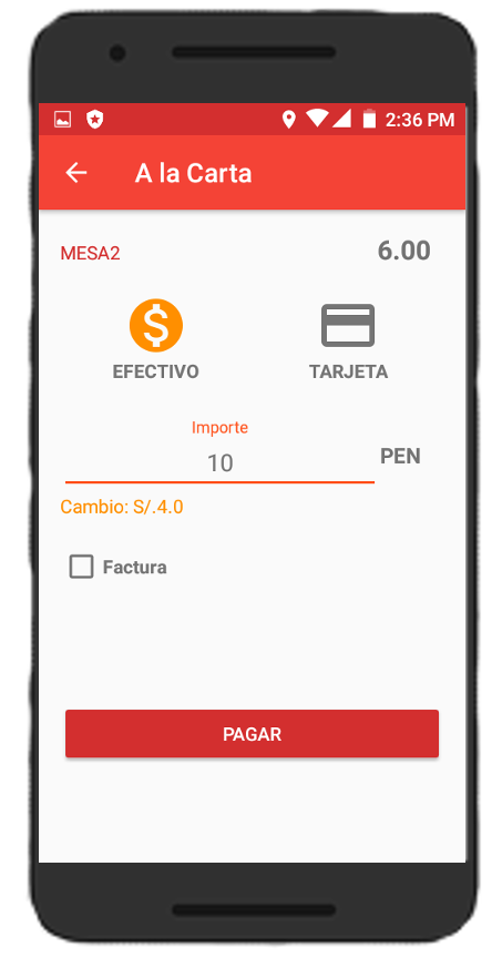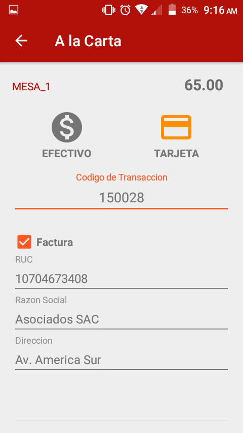 Para culminar el pedido, puede elegir entre registrar la venta con EFECTIVO, TARJETA ó YAPE. Además la opcion de registrarlo como factura.